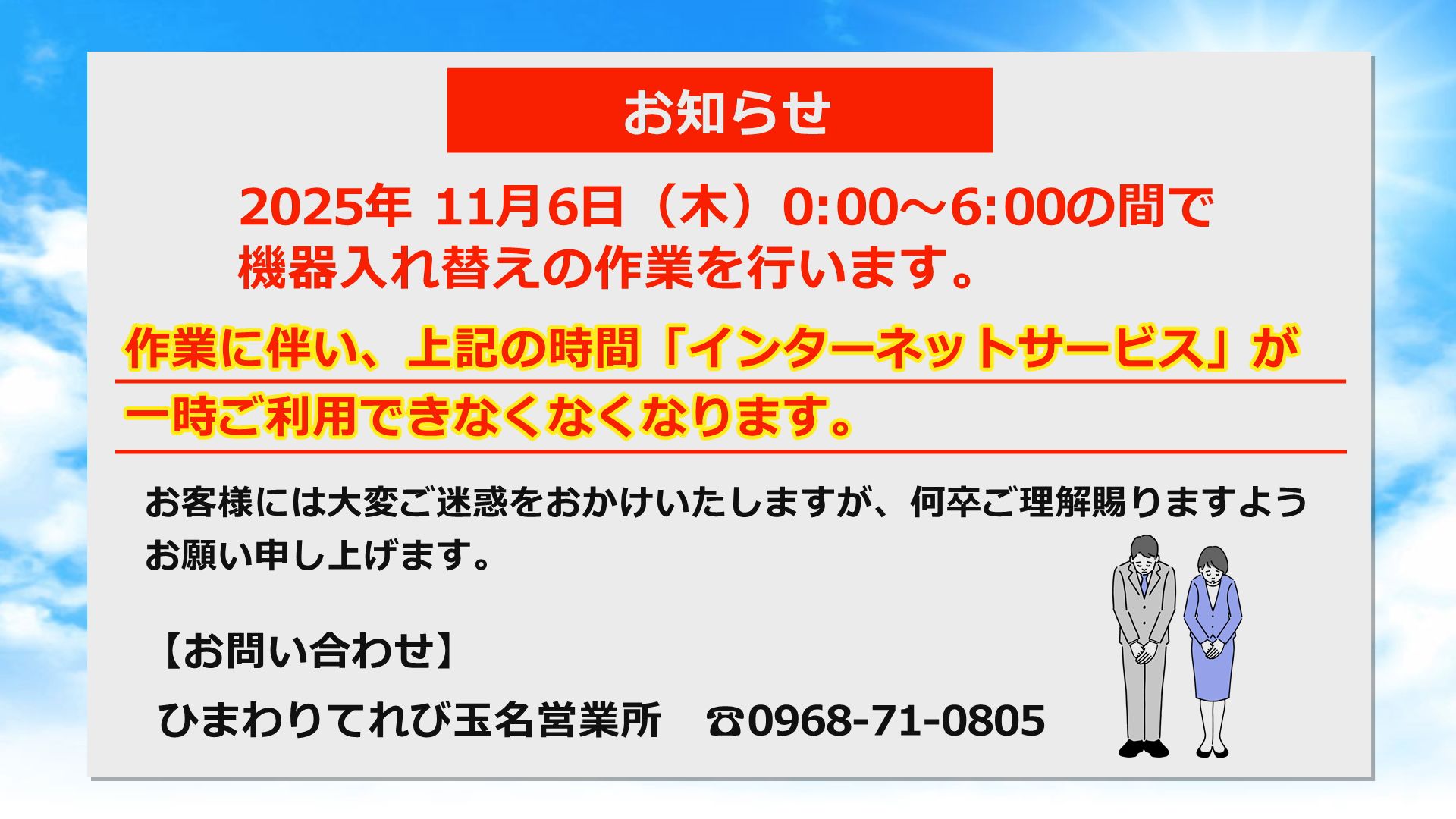 TOPページ > お知らせ > 【重要】インターネット機器入れ替えに伴い、一時ご利用ができなくなります